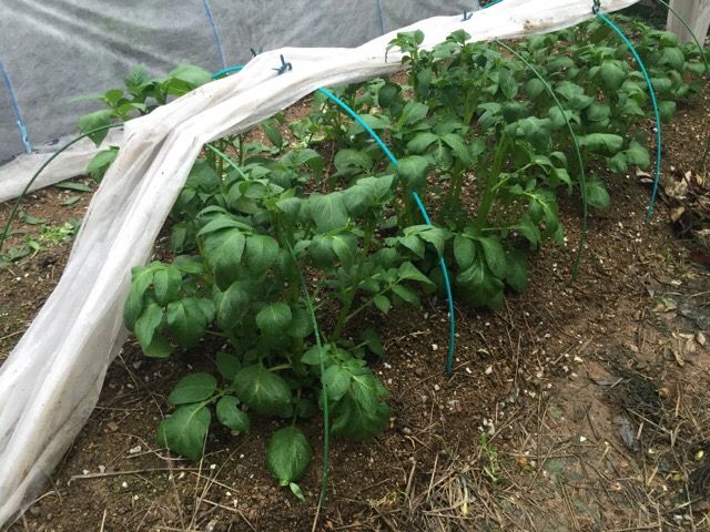 おっちゃん家のジャガイモは不織布に当たりだしたので不織布を外したんだな。昨秋のジャガイモでは芽かきを2本立てにしたところ、収穫時には大きなジャガイモが1個と小さなジャガイモが1個となんと収量の少なかったこと、、、。そんで、今回は倍の4本立て。収量を期待して、5月の下旬まで待つぜよ。