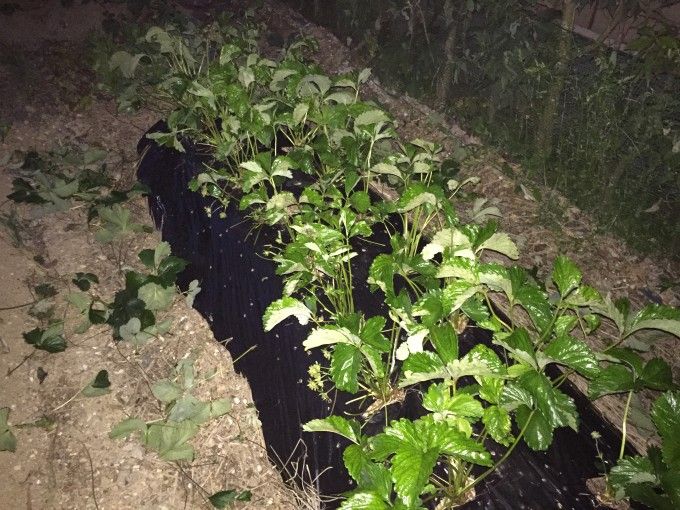イチゴがうどんこ病になっているんだな。さーて、困った。農薬を使わずに・・・よっし、重曹水をスプレー。。。翌日は苦土石灰スプレーと。。。。なんとか、セーフ。。。密植のせいか、、、葉掻きを暗くなる前にやってしまいましょ。。。。。風通しをよくして、元気を取り戻してもらおっ