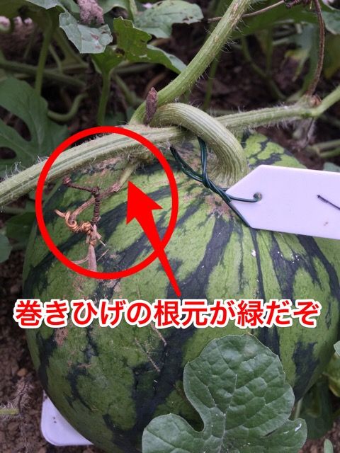 答えはカーンたん、スイカの実がなっているつるの付け根にある巻きひげ、こいつが完全に枯れたら収穫してよろしい。
